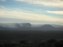 nein, weg von der küste, rauf in die berge und über den pass, und wow! was für eine landschaft öffnet sich da, die kleine karoo, eine weite ebene, eingefasst von wilden bergketten, über die wolken wie wasserfälle stürzen. rein nach oudtshoorn, in die straussenstadt, wo wir abends straussensteak und morgens straussenrührei essen, überall rechts und links der landstrasse grasen strausse, das ist ein schönes, friedliches nest, oudthoorn, hier muss ich später noch mal hin, aber nicht heute, nur noch eine tageslänge von kapstadt entfernt, nichts kann uns halten.